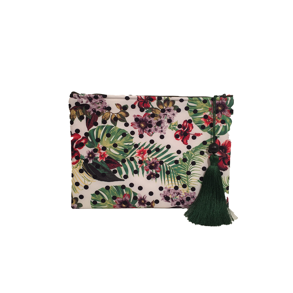 biclutch Clutch Vacation. Sehr schöne handgefertigte Clutch aus Stoff. Diese einzigartige Clutch ist mit exotischen Blättern und Blumen bedruckt. Das Innenfutter ist korallfarbend. Die am Reißverschluss befestigte Quaste ist abnehmbar. Maße: 28cm x 19cm.